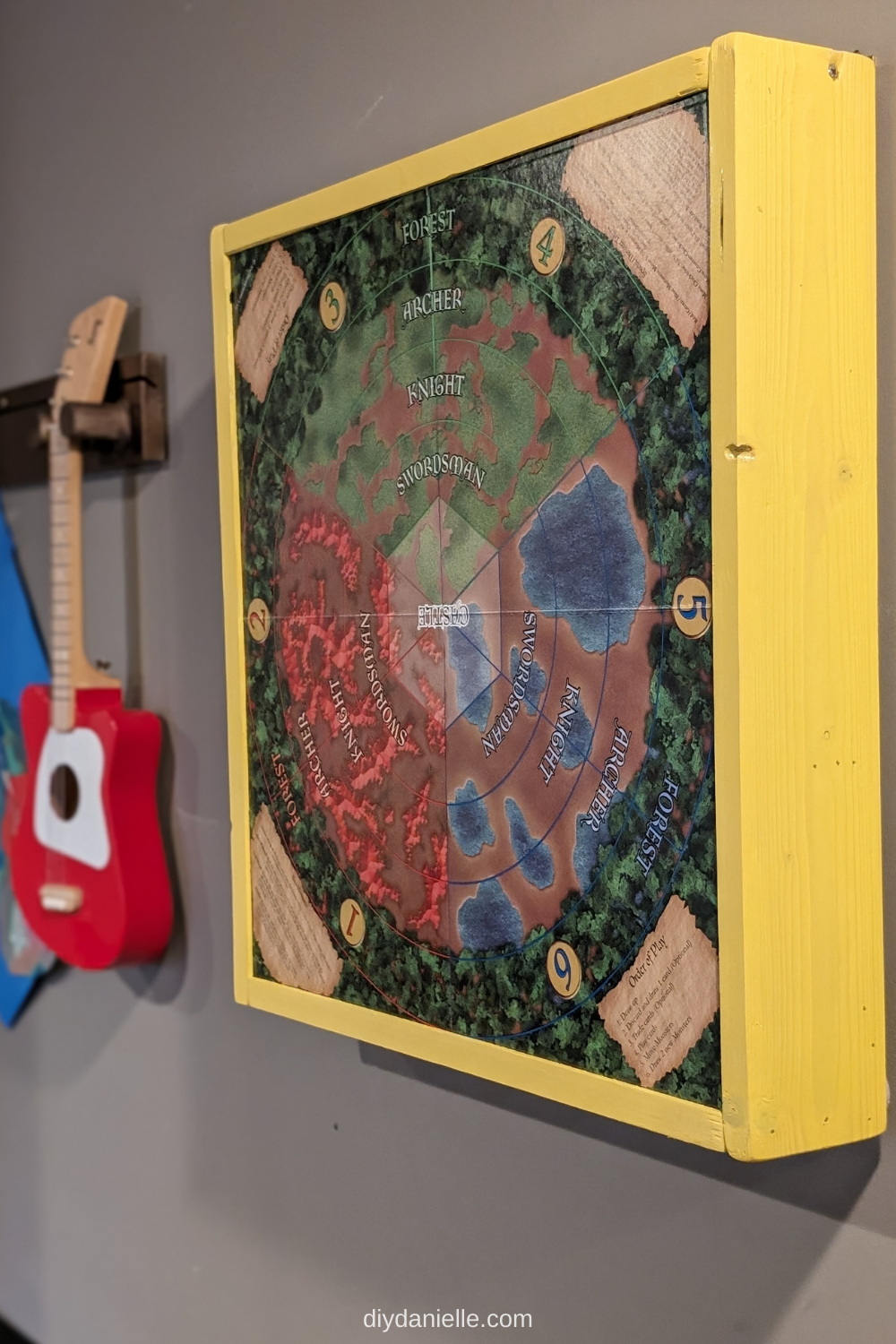 Step 10: Install it on your wall! When you want to play the game, just grab the frame off the wall, remove the box and pieces from the back, and set the framed board game display on a flat surface to play. You don’t have to remove the board, and the supporting frame creates an elevated surface to play on!