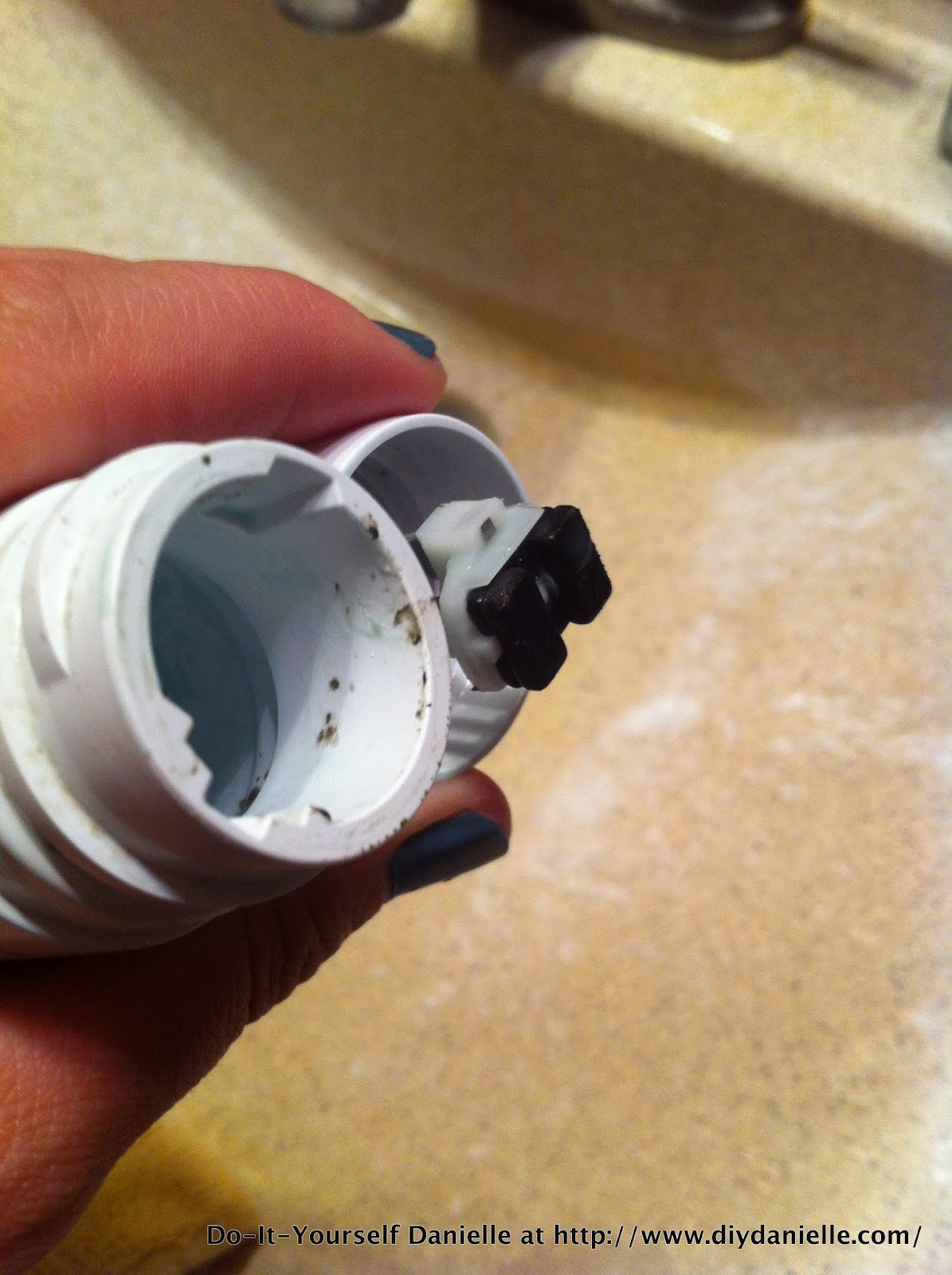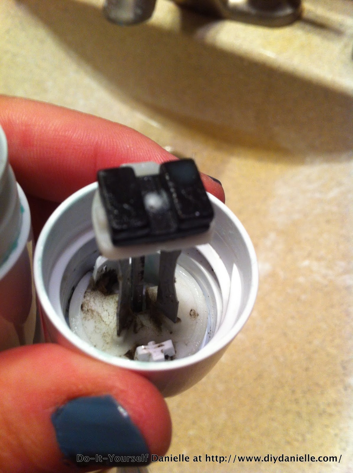 The picture on the left shows how my toothbrush comes apart (it’s a SoniCare). You can unscrew the head, such as you would to replace the head. Then you can also pop the top part off. Total = 3 different pieces. I usually rinse it and take a q-tip to clean out the areas that get gross. Stuff a rag inside to dry it all out after. Daddy B also soaked his in vinegar. What the heck right? Vinegar works for everything?