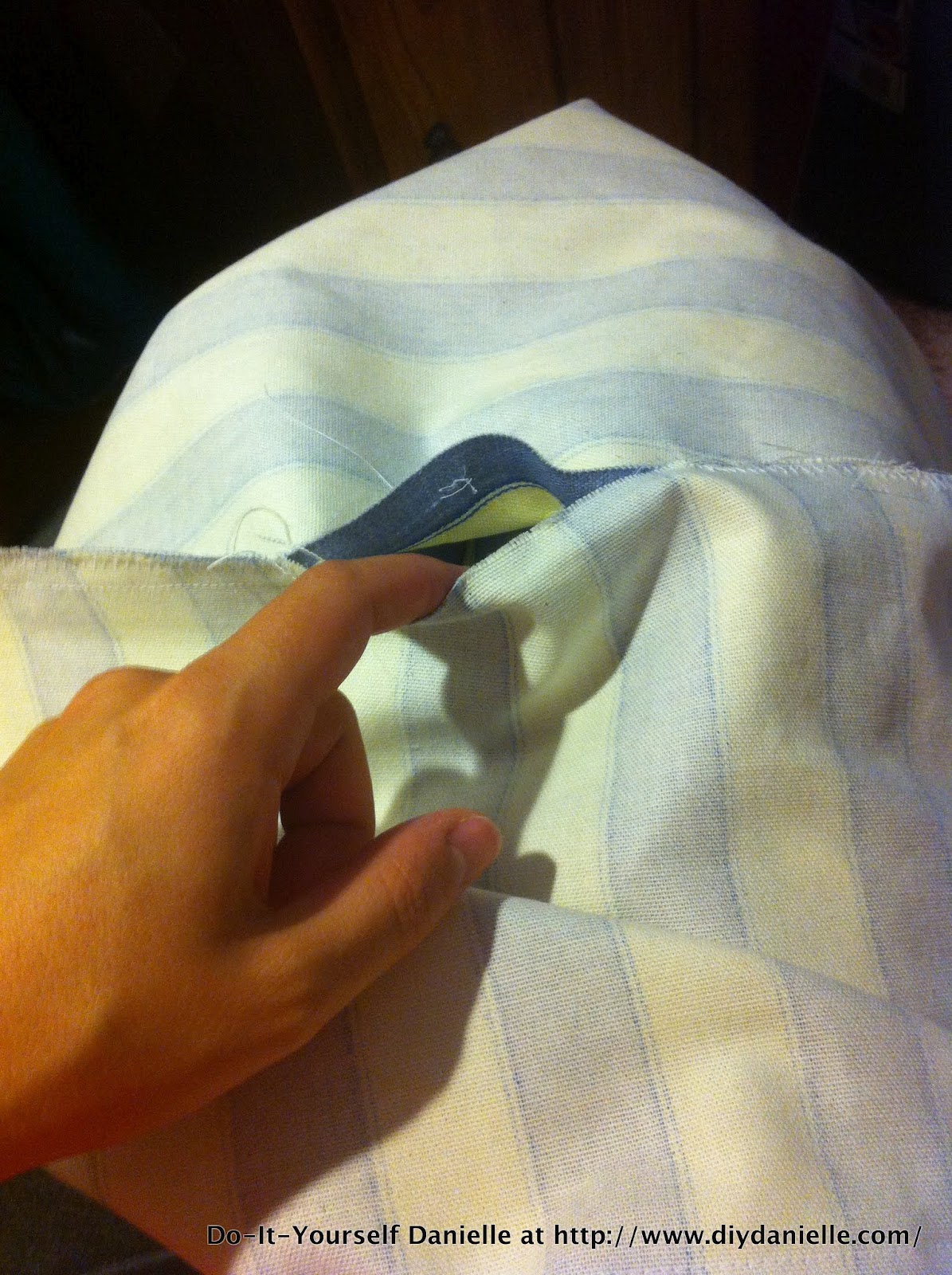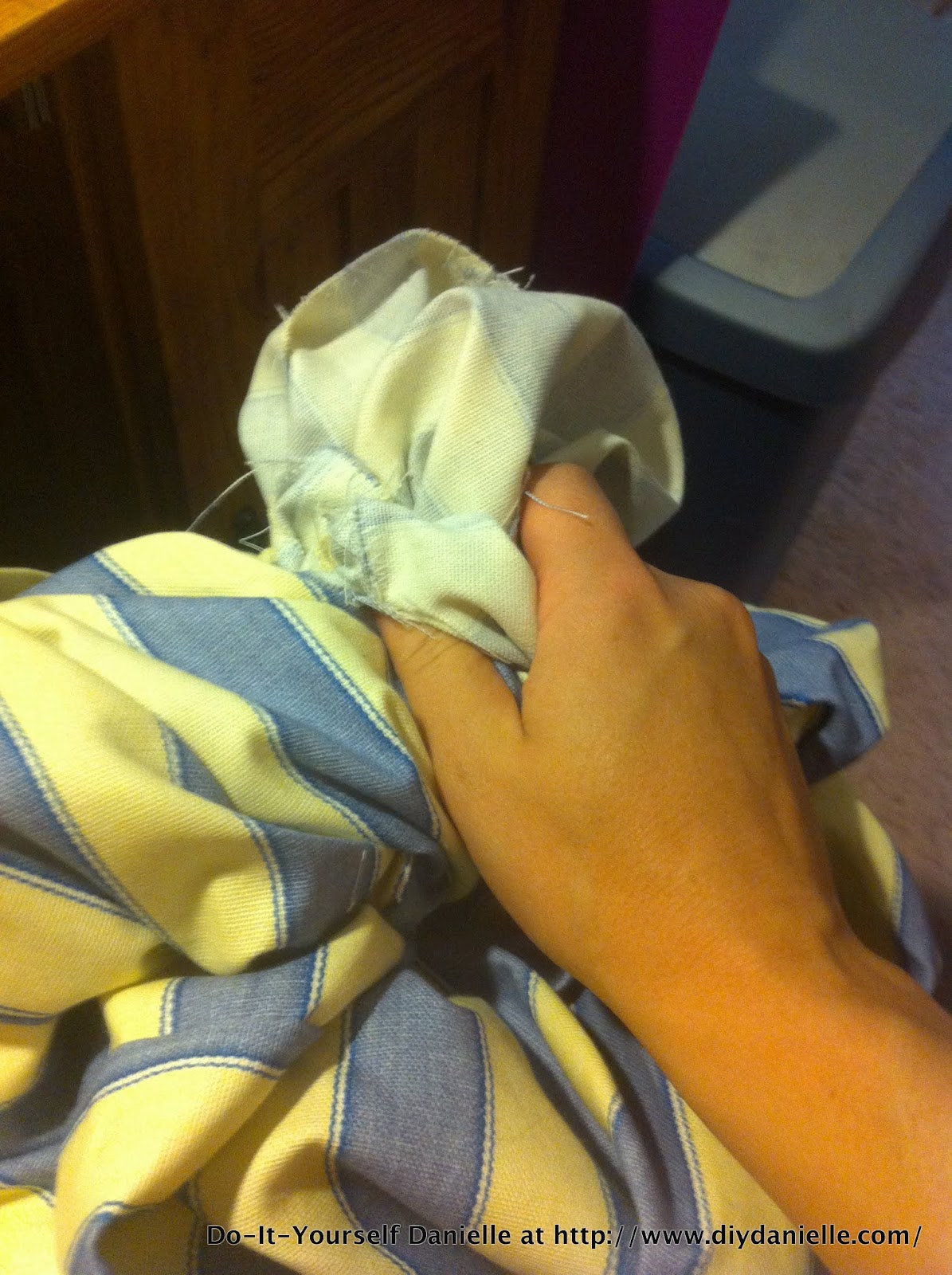 Step 1: Cut out your fabric. My pieces were 24″ x 24″ and 10″ x 96″… as recommended in the tutorial, I ended up cutting four separate pieces of fabric for the 96″ part. They were about 30″ x 10″ each so technically it was 120″ worth of fabric that I sewed together, and then I cut off the excess. I did it this way to ensure that I had exactly 96″ when I was done… it’s less math (because if you cut exactly 96″ worth of fabric, then you wouldn’t be accounting for seam allowances for sewing the individual pieces together).