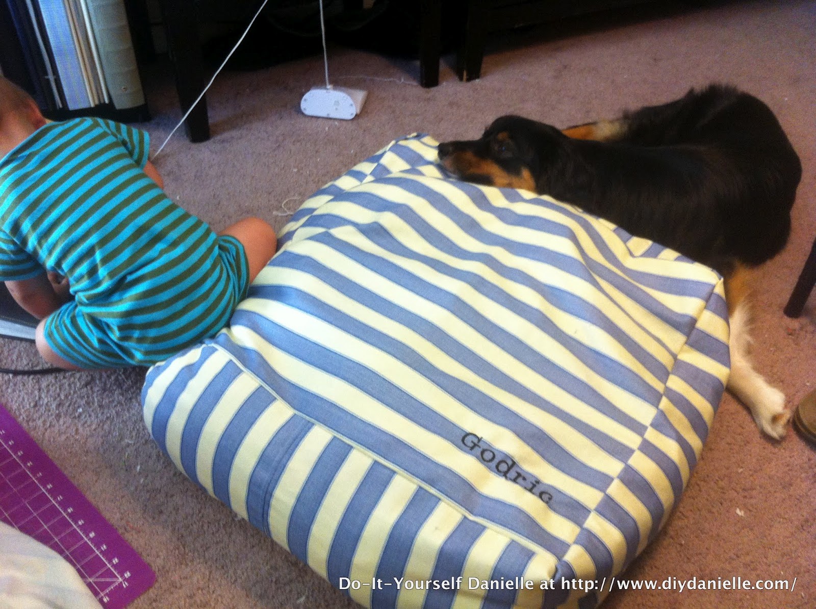 Seeing my sweet boy is about to be a toddler, I decided a floor pillow that was his size might be just the right thing for him as an additional birthday gift. I found a lot of tutorials, but I didn’t want it to be round… that looked harder to sew for some reason. I found this tutorial for a square pillow, but it was a little too high for him. What I decided to do was to take the measurements for that tutorial and tweak them. The tutorial called for two 24″x24″ pieces (the top and bottom) and one piece that is 13″x96″. The 13″ seems to be the height on their pillow (just from eyeballing the photo) so I decided to make that smaller. All the other measurements and the instructions should be the same.