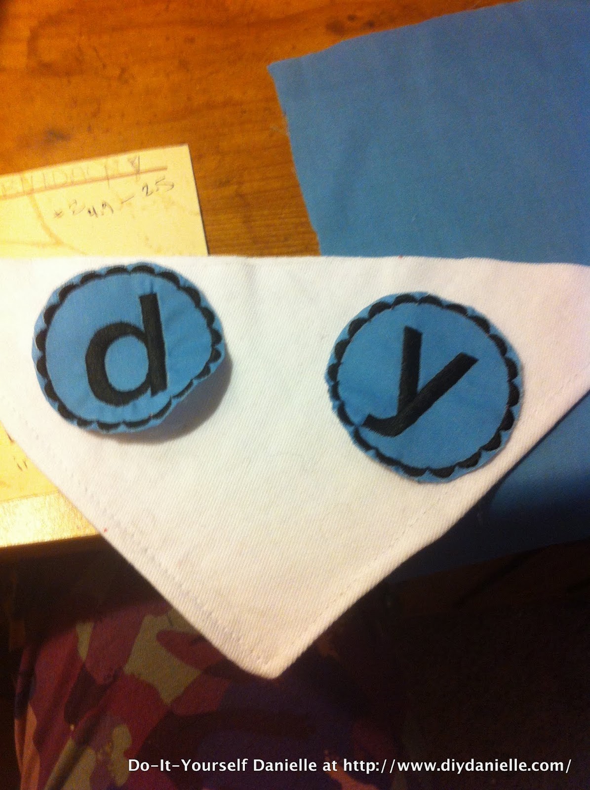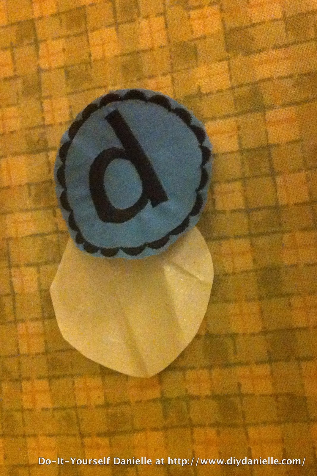 Once you’ve got them all embroidered, just tear away the stabilizer and cut a circle around the embroidery. I decided to use HeatNBond Lite to attach my letters to the banner. It has two sides to it that can both be ironed to fabric. One side is really rough feeling- that’s the side we work with first. Cut out circles of this for each letter, place the rough side of it towards the backs of your letters, then cover with a scrap piece of cloth and hold the iron over each letter for a few seconds. Check to see if it’s on good, then do the others.