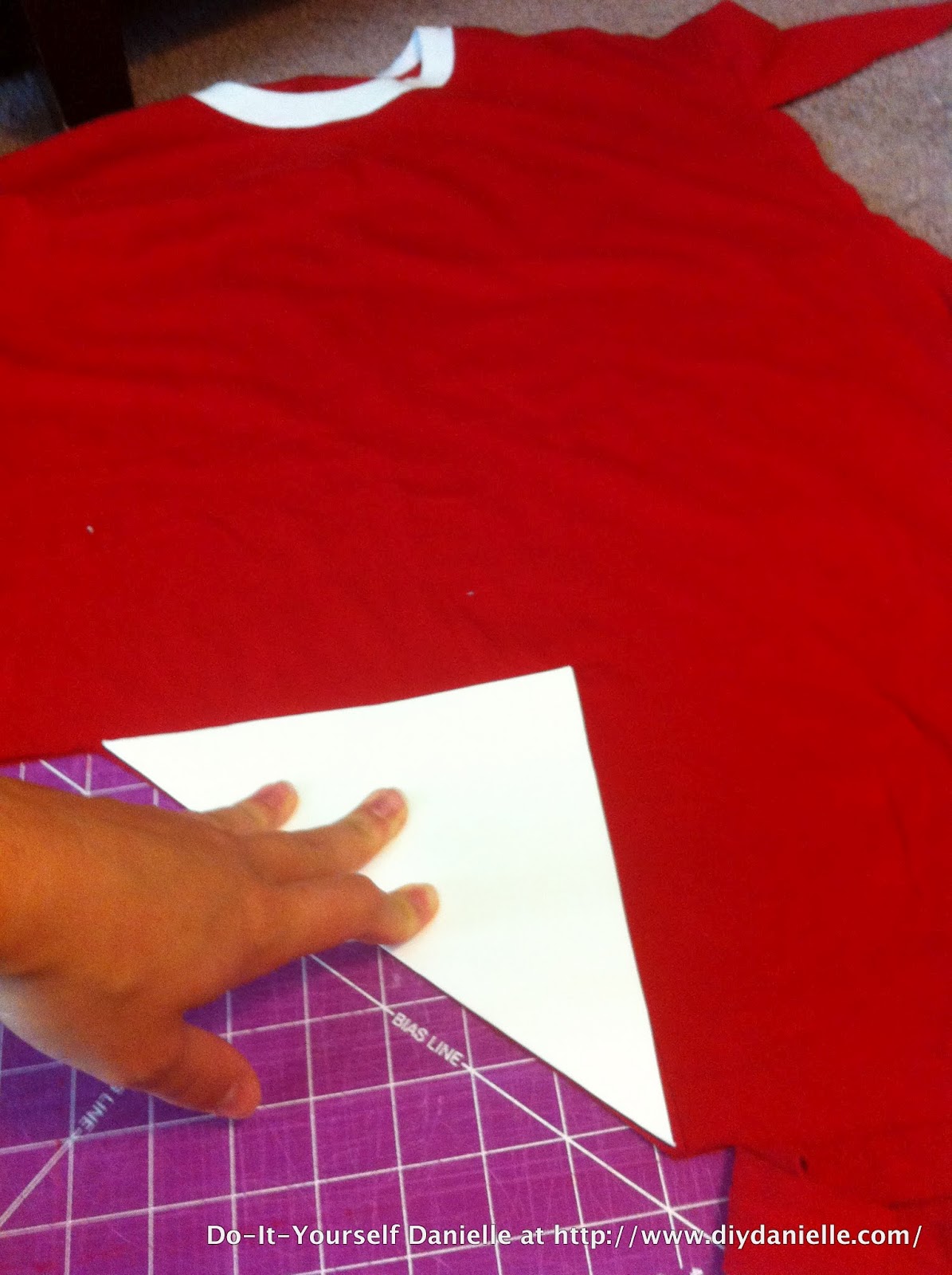 For all the fabric that I cut, I was able to cut out both the front and back pieces of the square at once- with the white fabric, I just folded it in half, and with the t-shirt I was cutting through both sides of the t-shirt. Here’s a picture of how to cut the triangles from your tshirt if you also decide to upcycle: