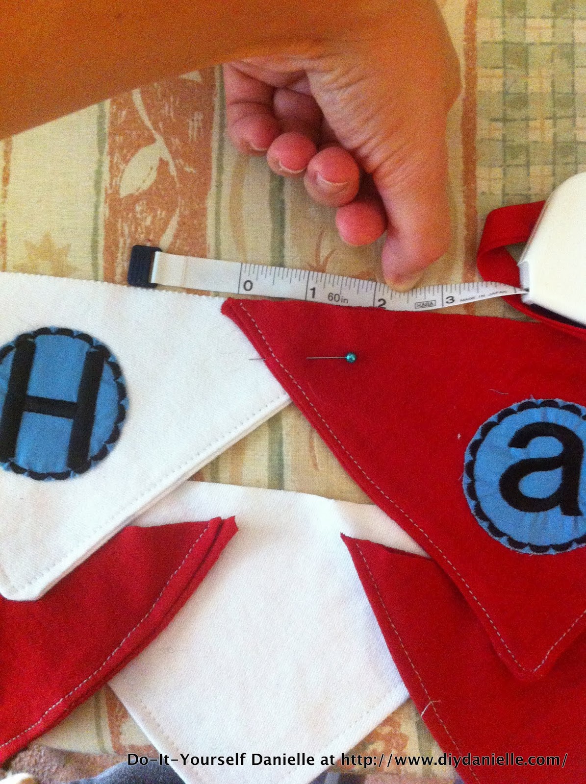 Layout your triangles exactly how you want them in terms of colors. I did red-white alternating with enough triangles for each letter, plus one extra in the middle for the “space” between happy and birthday. See if your bias tape is long enough for all of this! You can always overlap two sets of bias tape if needed but it’s nice to know in advance so you can plan accordingly. Mine only used one set.