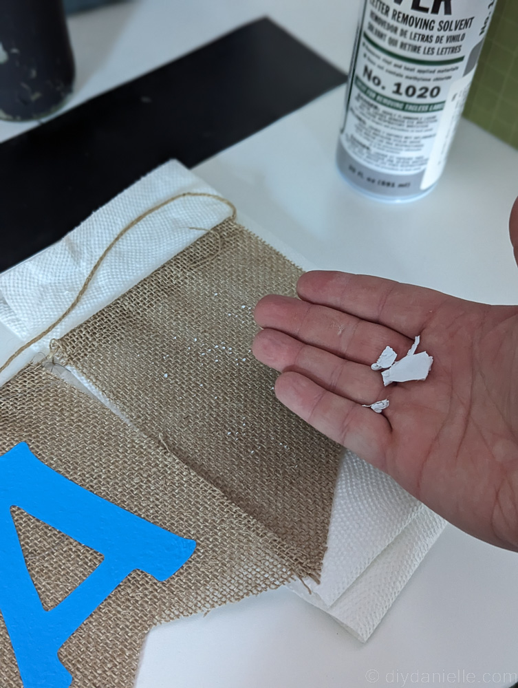 The fabric I’m showing this method on today is burlap and while it has a fragile weave, it was quite easy to remove the iron on from.
