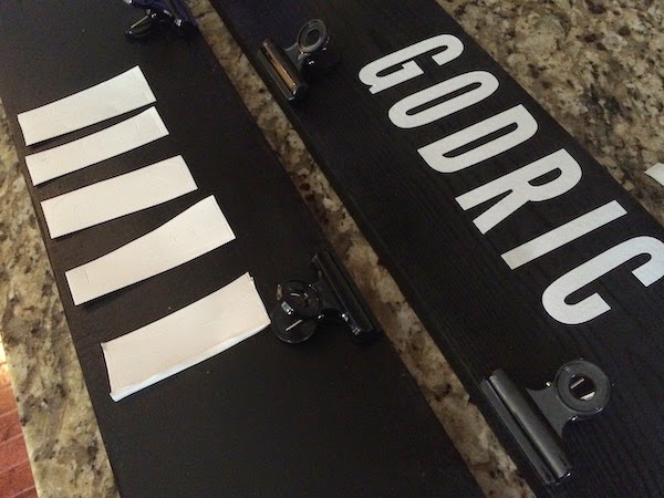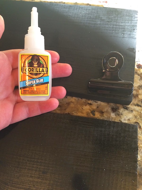 I marked out where I wanted my magnetic clips. Then I used Gorilla Super Glue to glue the flat magnet part of the clips to the wood board. Let dry. One thing to note is that I accidentally knocked one of these off after the glue had dried. The glue HOLDS… so the clip came off without the magnet. Not a big deal because I just used the super glue to replace it back onto the magnet. I love this glue.