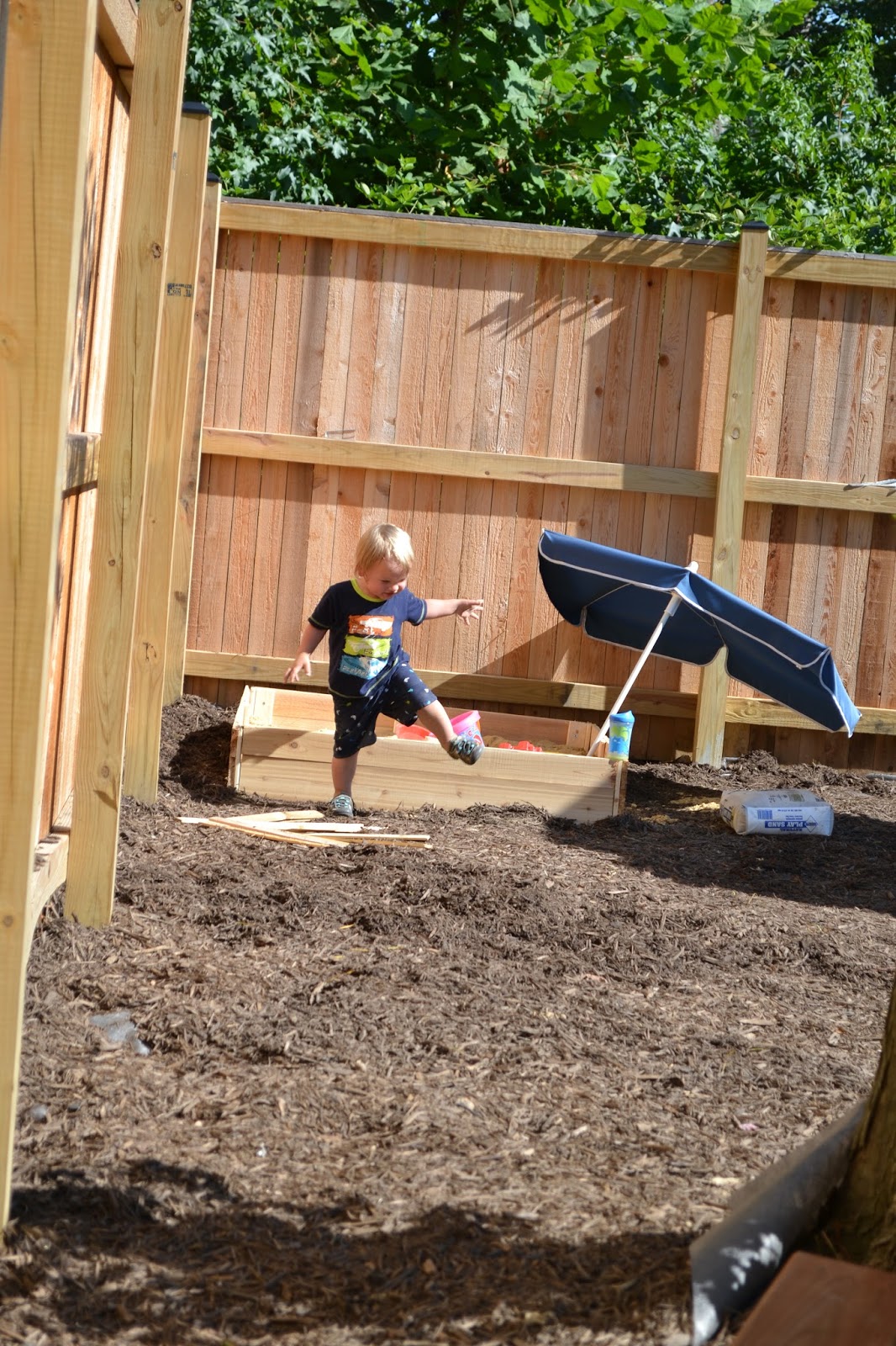 When we mulched our back area, we left a space open for the sandbox in the corner. It’s got landscaping fabric down to help keep weeds from growing up in the sandbox. Daddy B piled the sand in the middle while he worked on the box itself.
