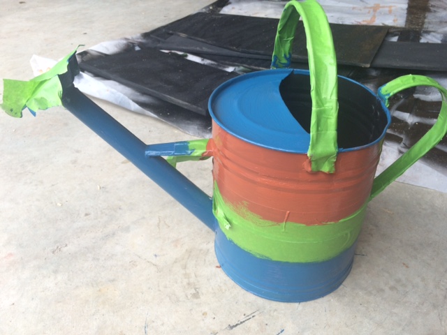 Tape the can: I covered the handles and the spout. I taped off the section for the white paint. To get the right measurements, I divided the height of the can by 3 and marked off where each stripe would need to be.